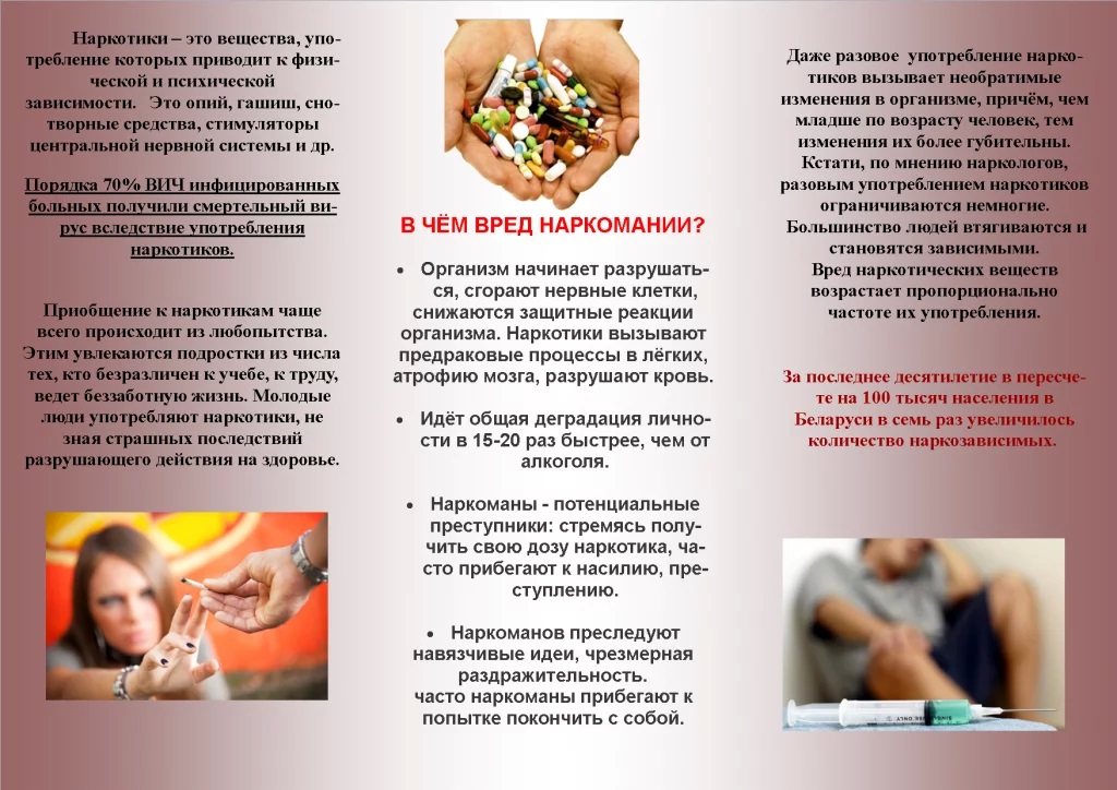 Наркомания — это настоящая беда современного общества. Она разрушает семьи, губит здоровье и просто убивает людей.Можно смело говорить о том, что профилактические меры — это лучший способ борьбы с распространением наркомании среди молодого населения. Для наглядной демонстрации вреда и разрушительного действия наркотиков на организм детям нужно регулярно читать поучающие лекции и демонстрировать документальные фильмы, в которых рассказываются все ужасы жизни